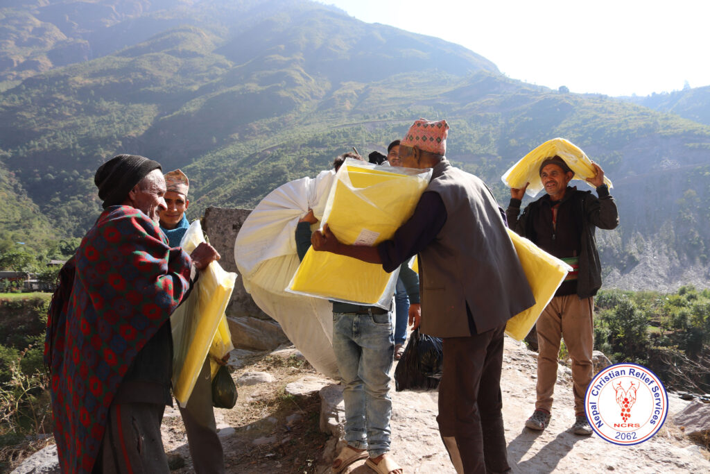 This devastation necessitates the distribution of tarpaulins for temporary shelter, warm blankets, mattress and other necessary needs. Therefore, from 7th-12th November 2023, the initial two phases of earthquake relief intervention in coordination and communication with the local administration have been concluded. NCRS team traveled to the most earthquake-affected area of Rukum West and distributed the relief items to the affected victims of wards no.4, 5, 6 & 14 of Aathbiskot Municipality. A total of 1000 HH received the Tarpaulin, 700 HH received P-Foam (Mat), 400 HH received warm blankets, 13 sets of Kitchen kits, and 8 big-size tents.